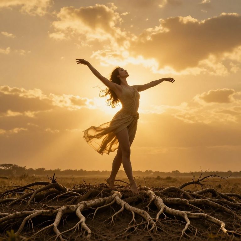 Silhouetted dancer in flowing dress stands on root mound at sunset, arms gracefully raised, against golden sky with scattered clouds. Photographic image.
