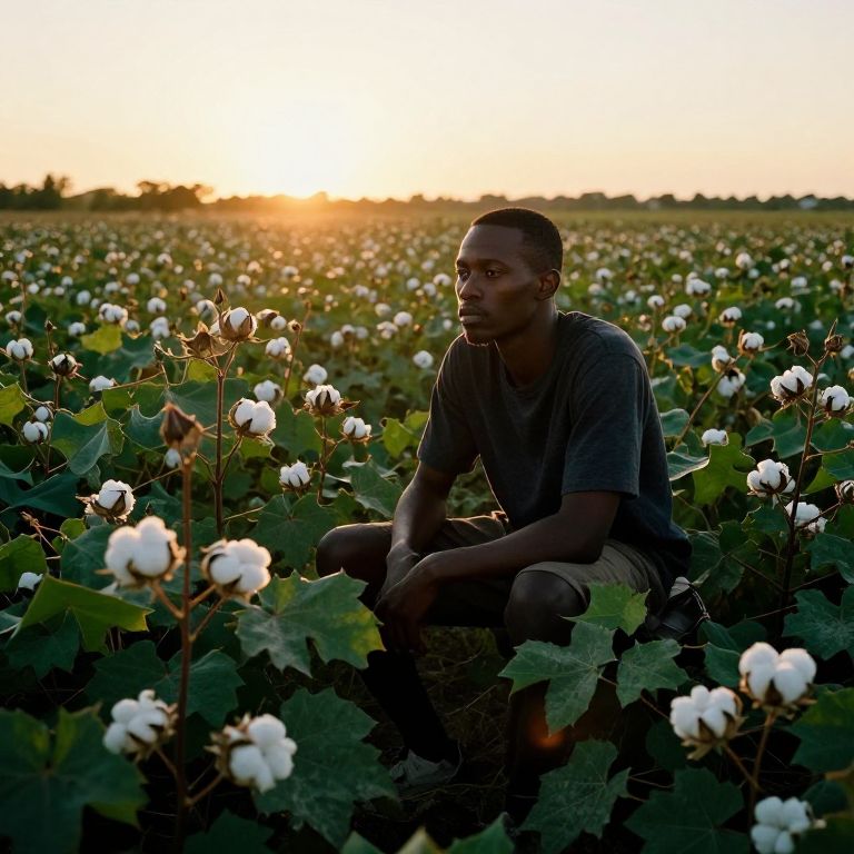 Scene of a black person sitting amidst a cotton field at golden hour, deep rich colors with strong contrasts between the green leaves and white cotton, thoughtful expression, warm backlight illuminating the landscape, painterly realism