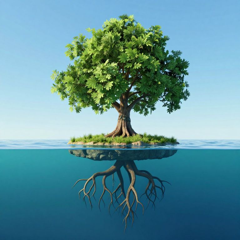 Digital illustration of a lush green tree with intricate roots submerged in clear blue water, reflecting on the surface.