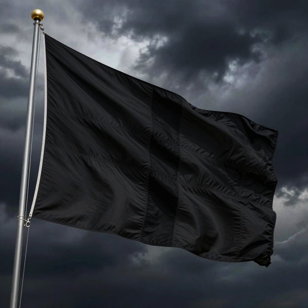 Black cross flag waving dramatically in the wind, high contrast, dark stormy sky background, detailed fabric texture, cinematic lighting, photorealistic style