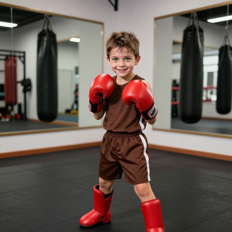 A young boy with short brown hair, bright green eyes, and a friendly smile, wearing a brown athletic outfit with red boxing gloves and red boots. He stands confidently in a well-lit gym corner, with a slight sweat on his forehead, ready to train. The background shows a modern boxing gym with padded walls, a large mirror, and a visible punching bag. The atmosphere is energetic and vibrant, with soft lighting highlighting his focused expression and dynamic pose.