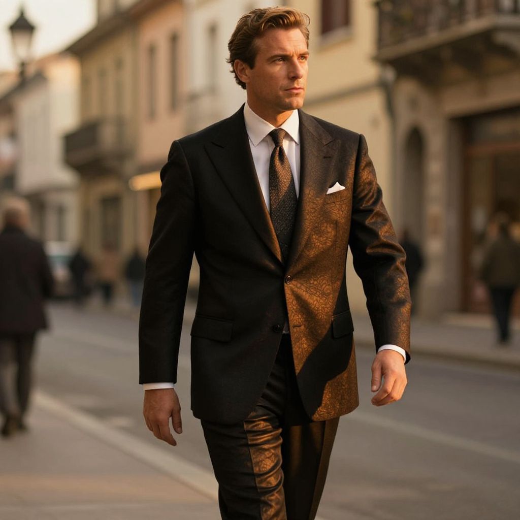 Photograph of a handsome Caucasian man with light brown, neatly styled hair, wearing a dark brown, patterned suit with a white shirt and black tie. He has a confident expression and is walking down a sunlit, urban street with blurred, old European-style buildings in the background. The suit features a white pocket square. The lighting casts a warm glow, highlighting his polished appearance. The street is slightly out of focus, with a few indistinct pedestrians in the distance. The overall mood is sophisticated and elegant.