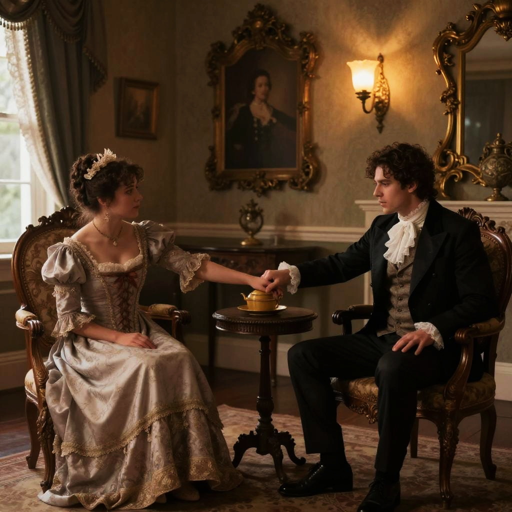 Spanking experience in a vintage Victorian parlor, soft warm lighting, detailed ornate furniture, expressive characters with intricate costumes, moody atmospheric shadows