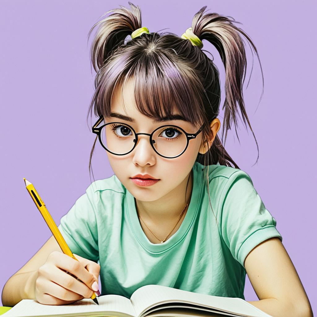 An anime-style portrait of a bright-eyed young girl sketching in a notebook with round glasses and messy ponytail. Styled with a soft lavender and mint green and a yellow-white background, vibrant and modern.