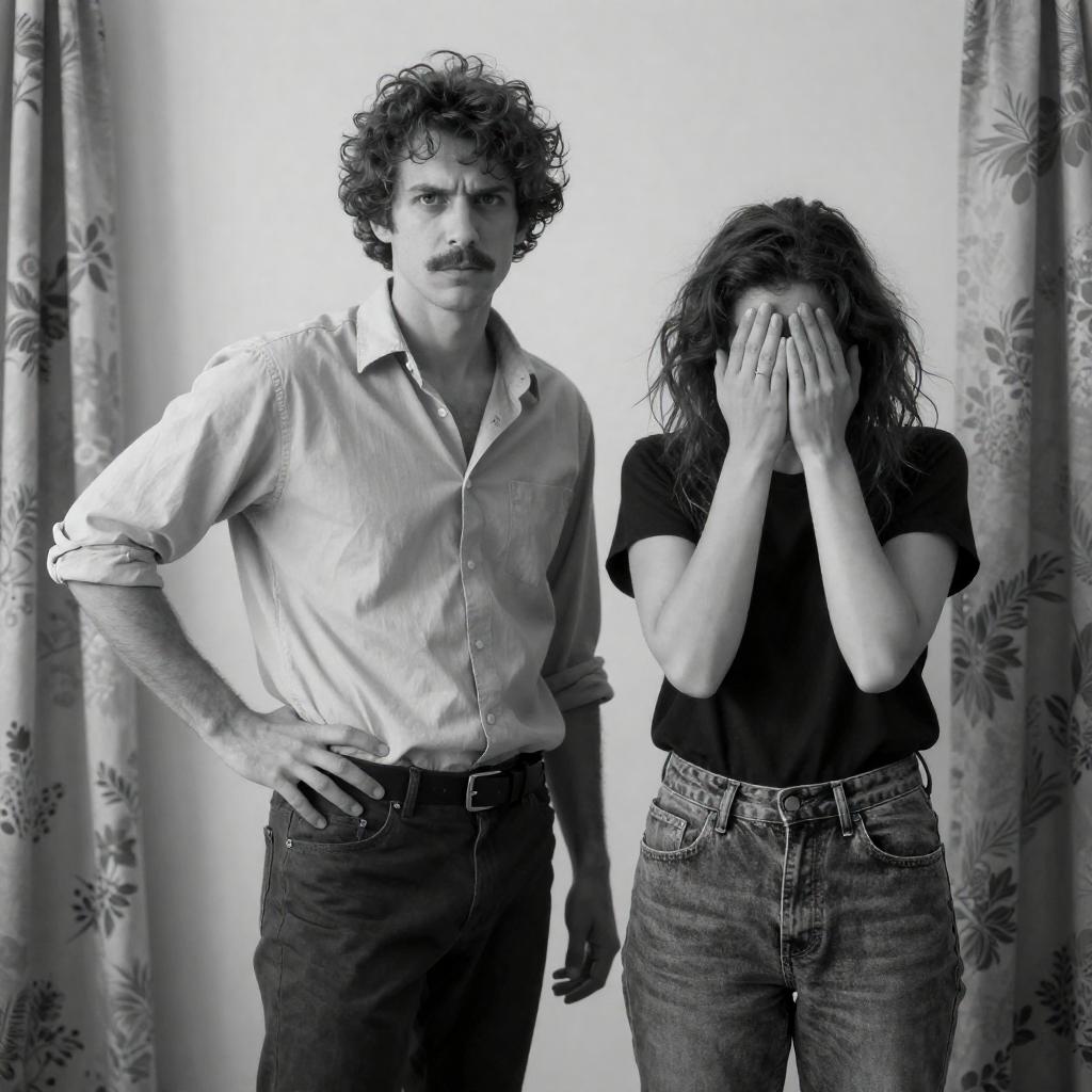 Black and white photograph of a man and woman. Man with curly hair, mustache, loose shirt, dark pants, hand on hip. Woman with messy hair, black t-shirt, jeans, covering face with hands, leaning away. Floral curtains on both sides. Man's expression intense, woman's expression hidden. Man stands on left, woman stands on right.