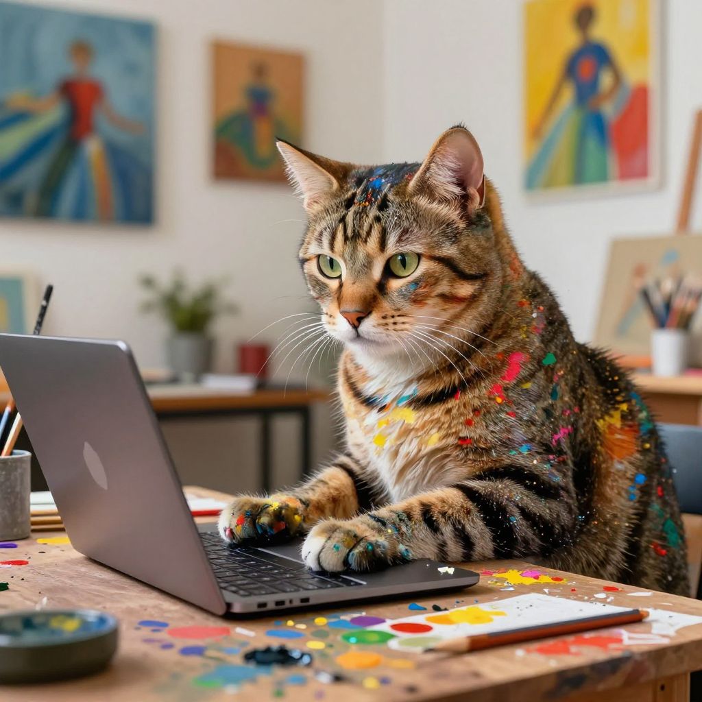 A detailed digital artwork of a tabby cat with vibrant splashes of paint on its fur and surroundings, intently typing on a laptop in a colorful, paint-splattered artist's studio filled with artworks on the walls and art supplies on the table.