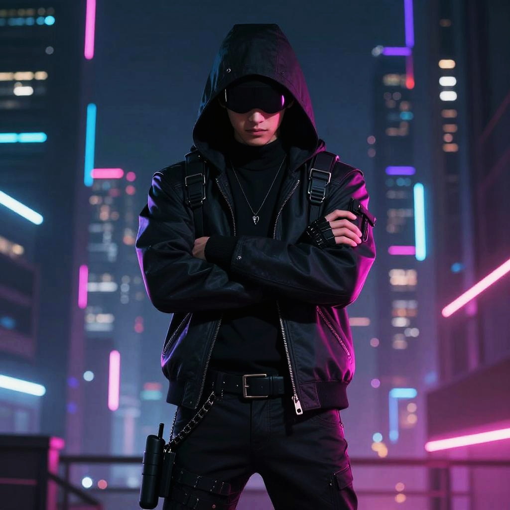 Villain with eye patch standing in a dark alley, dramatic shadows, cyberpunk cityscape background, neon lights reflecting off wet pavement, intense gaze, cinematic lighting