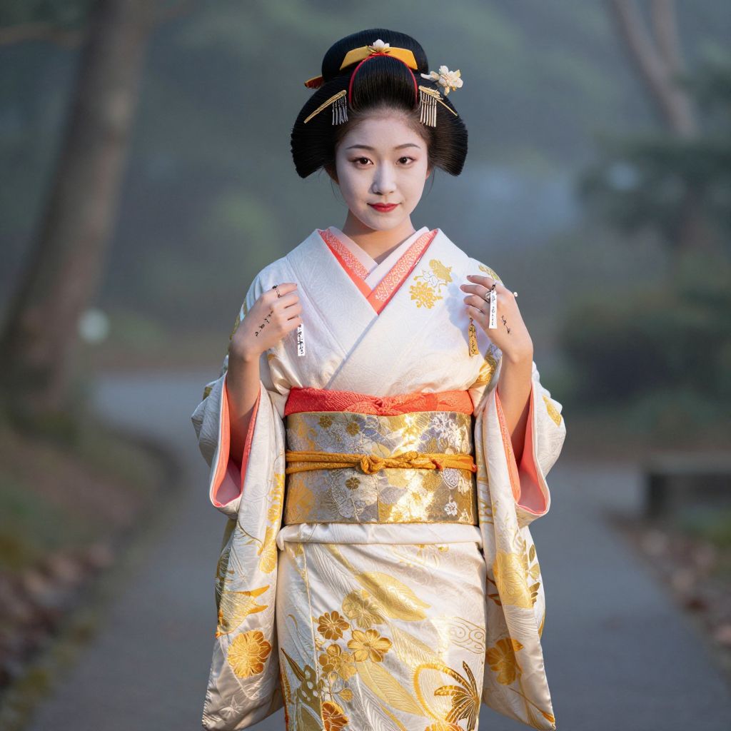 A vividly detailed Japanese geisha-inspired woman in a refined white and gold kimono, walking through a misty forest path during early morning, her face glowing with natural beauty, with long, slender fingers adorned with traditional calligraphy-style jewelry, the morning light reflecting off her silk fabric. The woman has big tits and cute face