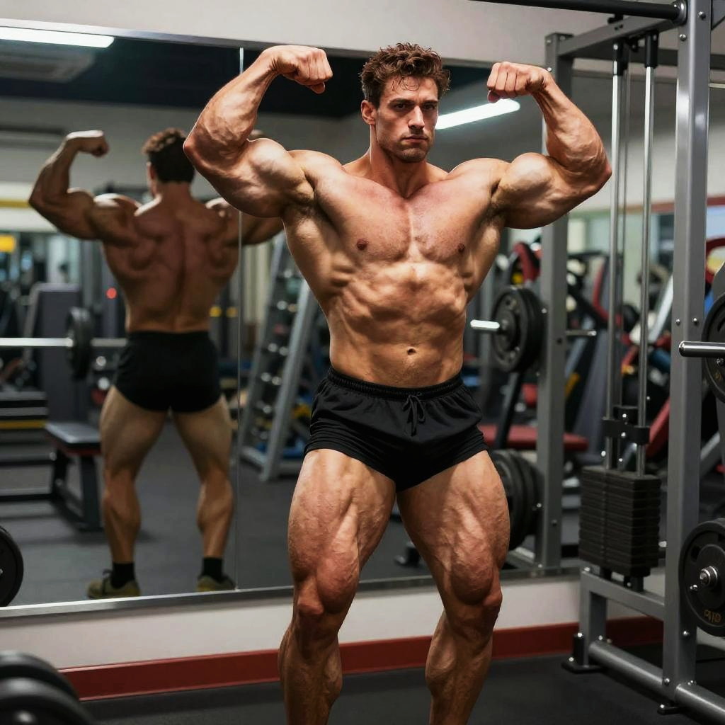Sims 4 bodybuilder flexing in front of gym mirror, strong and exaggerated muscles, intense gym environment with weight racks, striking shadows and reflections, high detail digital rendering, artistic fitness portrait style.