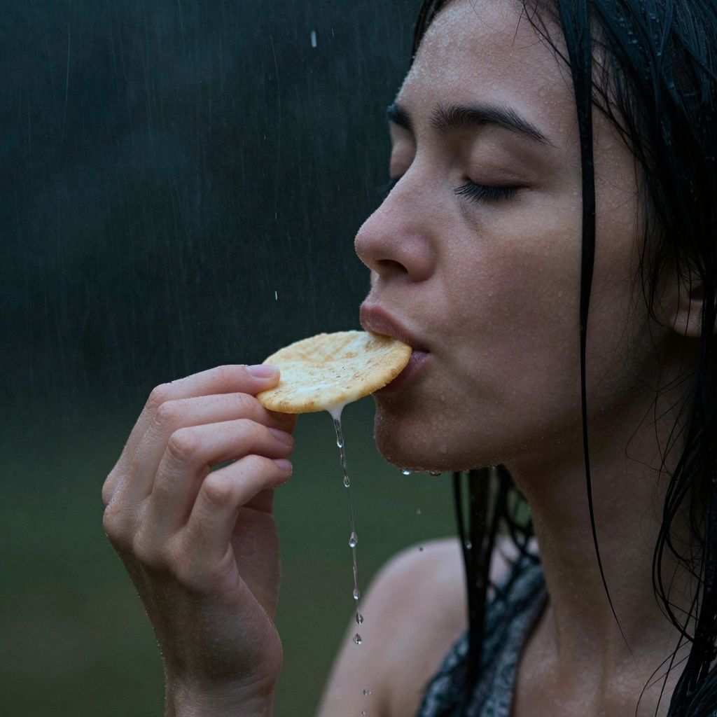 Photograph of a wet-haired woman with closed eyes, biting into a dripping water-soaked cracker, rain visible in the background.