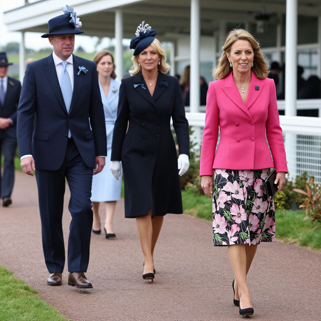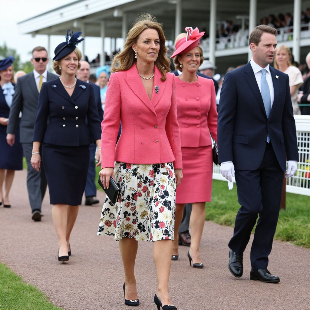 Photograph of a formal outdoor event featuring four adults walking on a paved path. The central woman, with wavy brown hair, wears a bright pink blazer and a white floral skirt, black heels, and a necklace, smiling confidently. To her right, another woman in a matching pink blazer and skirt, black hat with a red ribbon, and black heels, smiles subtly. To the left, a woman in a navy double-breasted blazer and skirt, black hat with a navy bow, and black heels, walks with a slight smile. To the far right, a man in a black suit, white shirt, and black tie, with short brown hair and white gloves, walks with a neutral expression. Background includes a white building with a balcony and green grass.