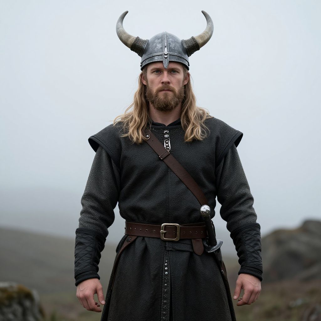 Modern viking costume, 1boy, beard, male focus, solo, facial hair, horns, fake horns, helmet, blonde hair, standing, long hair, belt, facing viewer, arms at sides, weapon, horned helmet, long sleeves, closed mouth, sword
