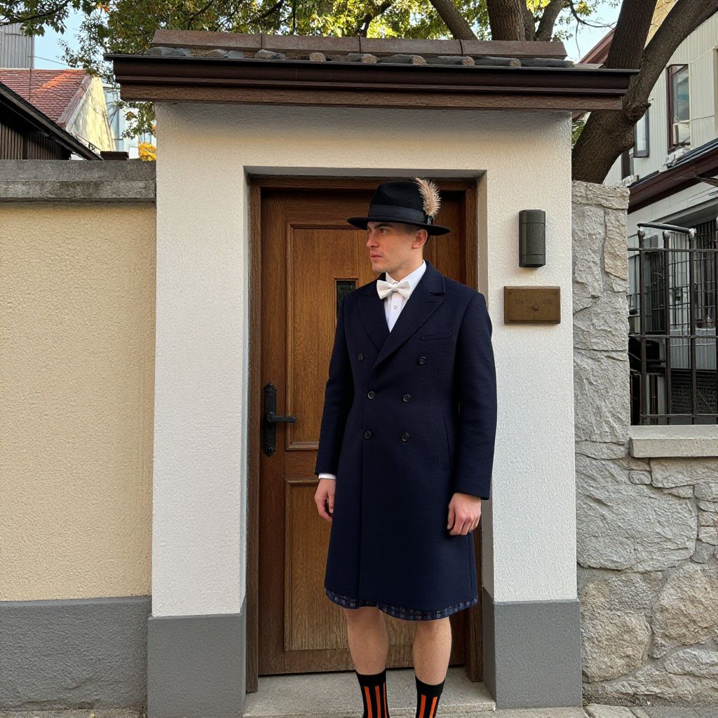A stylish male figure stands in front of a charming old building with a wooden door, wearing a dark blue coat with a subtle patterned skirt that adds a playful contrast to his masculine silhouette. He completes the look with black socks featuring bold vertical stripes, a white bow tie that adds elegance, and a black fedora hat adorned with a soft, natural feather on top. The scene is set in a cozy, slightly rustic urban neighborhood, with soft sunlight filtering through the trees behind the building, casting gentle shadows. The atmosphere is warm and inviting, emphasizing the man's unique fashion and timeless charm.