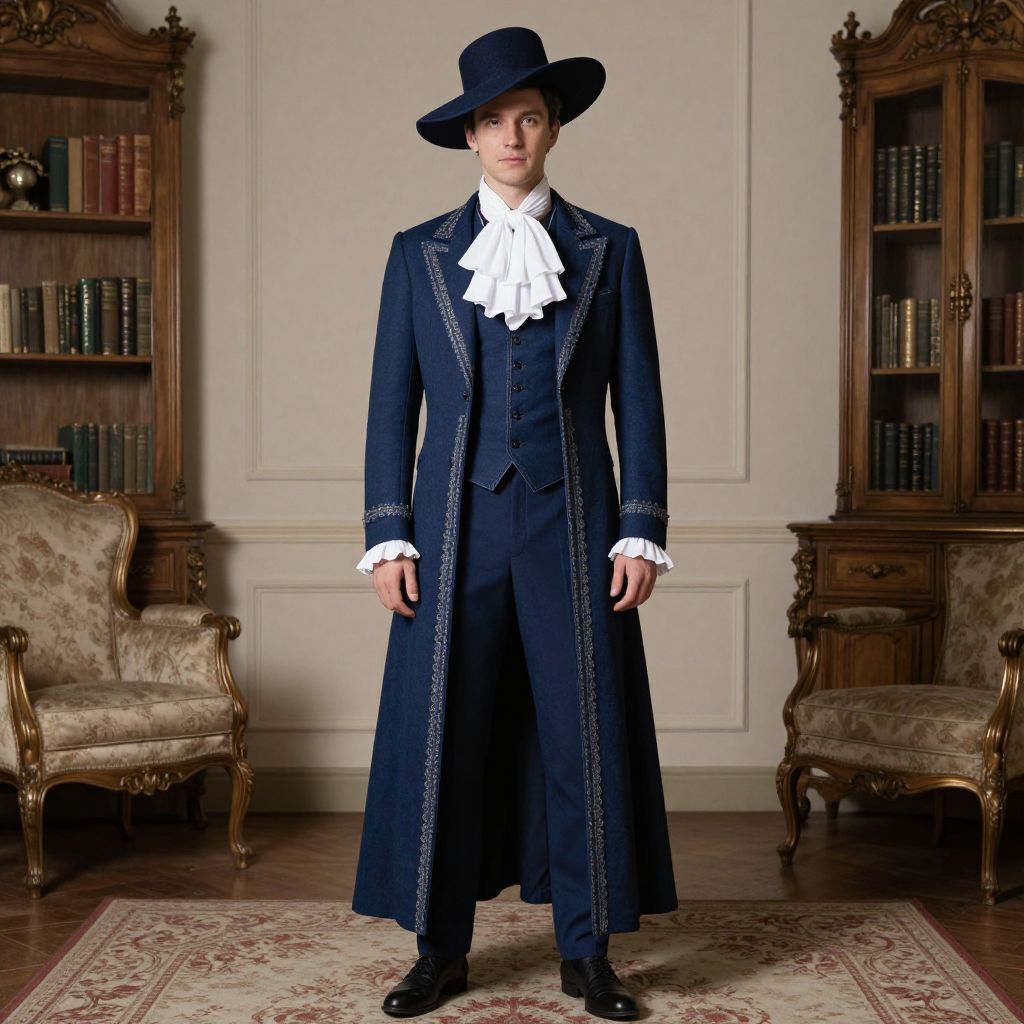 Octavius Costume, man in a blue dress and a hat standing in a room