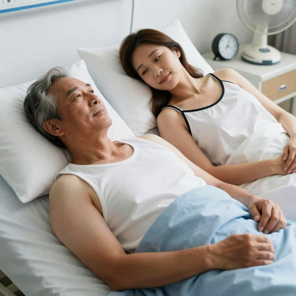 Middle-aged man and woman in hospital bed, both lying down. Man in white tank top, woman in white and black camisole. Man has gray hair, woman has brown hair. Woman's hand on man's stomach, both with relaxed expressions. White pillows, blue blanket, bedside table with clock and fan in background. Woman's left arm above head, man's left arm at side. Soft lighting.