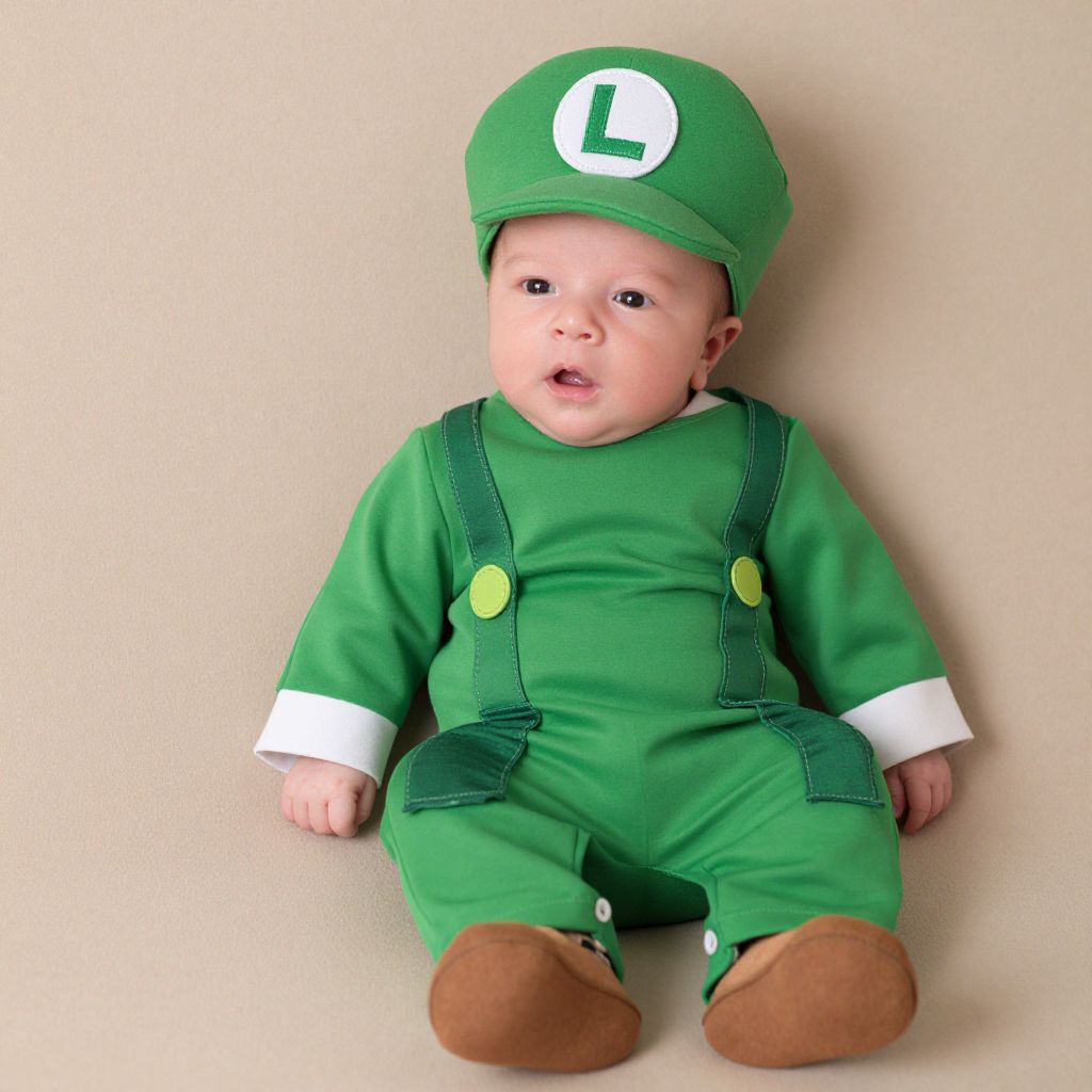 Photograph of a baby in a green Mario costume with hat, overalls, and brown shoes, sitting against a beige background.