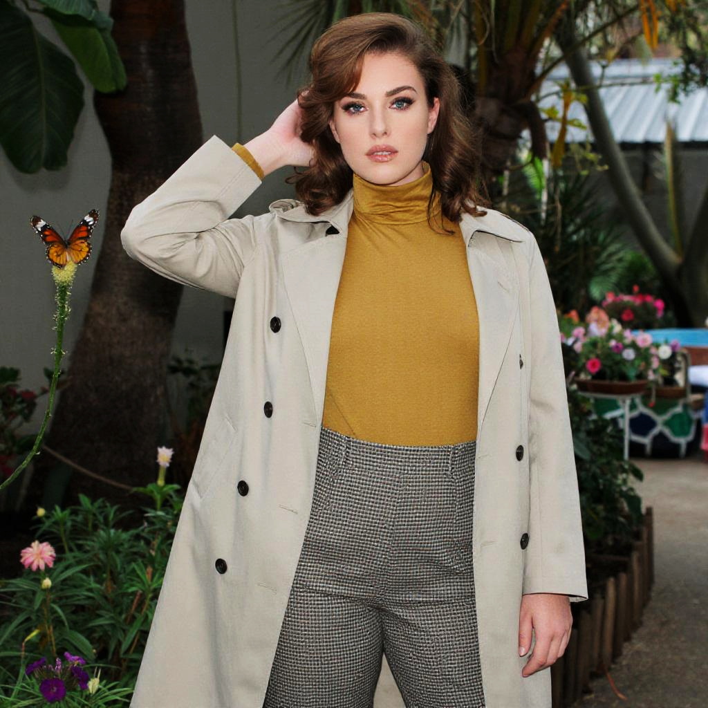 A voluptuous woman in a contemporary casual style, wearing a beige trench coat, mustard-yellow turtleneck, and high-waisted checkered trousers, stands gracefully in a tropical garden with a butterfly garden, captured in the soft tones of Eastman LLP film stock. Sexy. Pretty face and beаutiful eyes. Big breasts