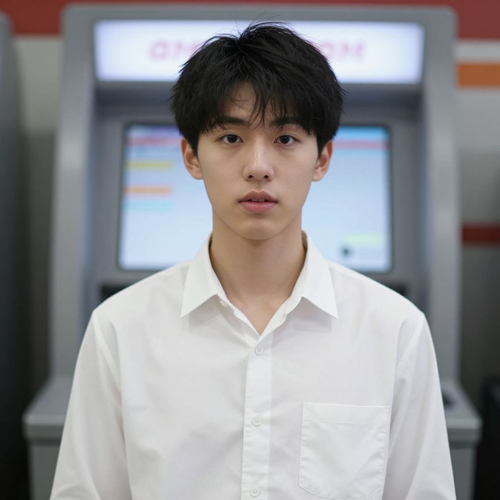 Photograph of an East Asian young man with straight, black, slightly messy hair and fair skin, standing in front of a brightly lit ATM machine. He has a neutral expression, with slightly parted lips and dark, almond-shaped eyes. He is wearing a crisp, white, long-sleeved dress shirt with a collar buttoned up. The background is blurred, emphasizing the ATM's glowing screen and metallic frame. The overall scene conveys a clean, modern, and slightly sterile environment. The lighting is bright and even, highlighting the subject's face and attire.