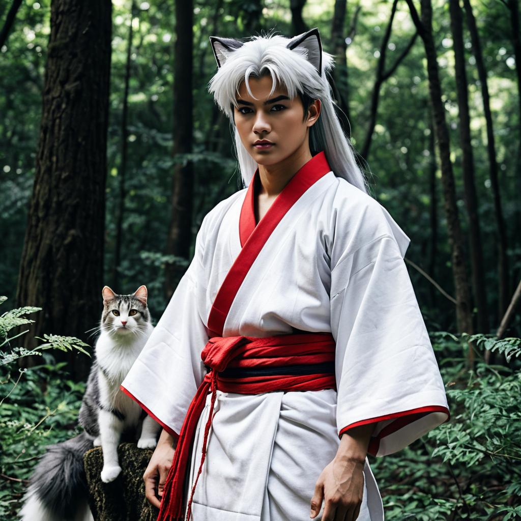 Photorealistic image of a young Asian man dressed in traditional white and red kimono with a red sash, cosplaying as Inuyasha. He has long silver hair styled with cat ears headband and a serious expression. The full-body portrait is set in a dense, green forest with natural daylight illuminating the scene. A gray and white cat sits on a rock beside him, complementing the cosplay theme.