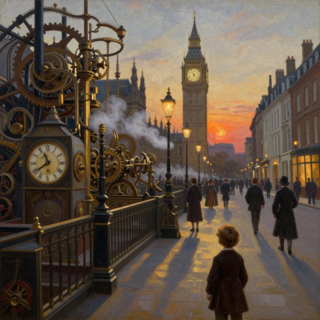 Photorealistic digital painting of a sunset over Westminster Bridge in London. The foreground features a large, ornate clock with gold gears and steam rising from it, located on the left. A small child in a brown coat faces away, standing near the clock. The background shows the iconic Big Ben clock tower, bathed in warm orange and pink hues of the setting sun. Pedestrians, dressed in dark coats, walk along the bridge, casting long shadows. Victorian-style street lamps line the bridge, and historic buildings flank both sides. The sky is a gradient of orange, pink, and blue.