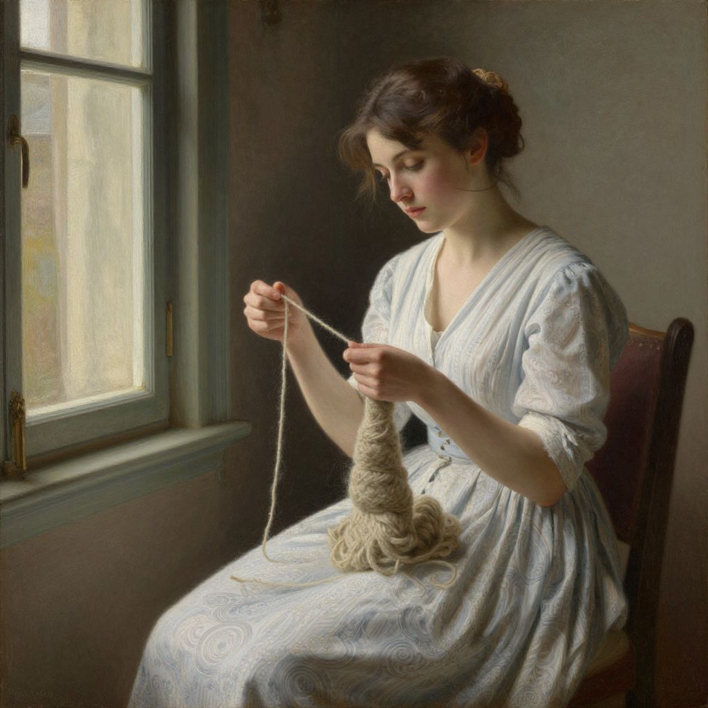 A woman in a vintage-style dress sits by a window, skillfully spinning wool with a serene focus, captured in a detailed, realistic artistic style reminiscent of traditional oil paintings, evoking the timeless charm of classic European art.