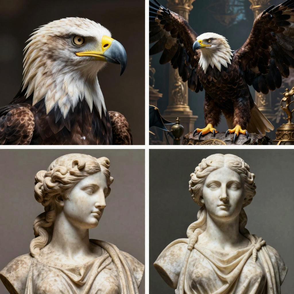 This image is a collage of four digital art pieces featuring a detailed, realistic eagle head with sharp beak on the top left, a book cover with an eagle in a dark, ancient setting on the top right, a classical stone statue of a woman with curly hair on the bottom left, and another book cover with a stone statue of a woman with a stern expression on the bottom right.