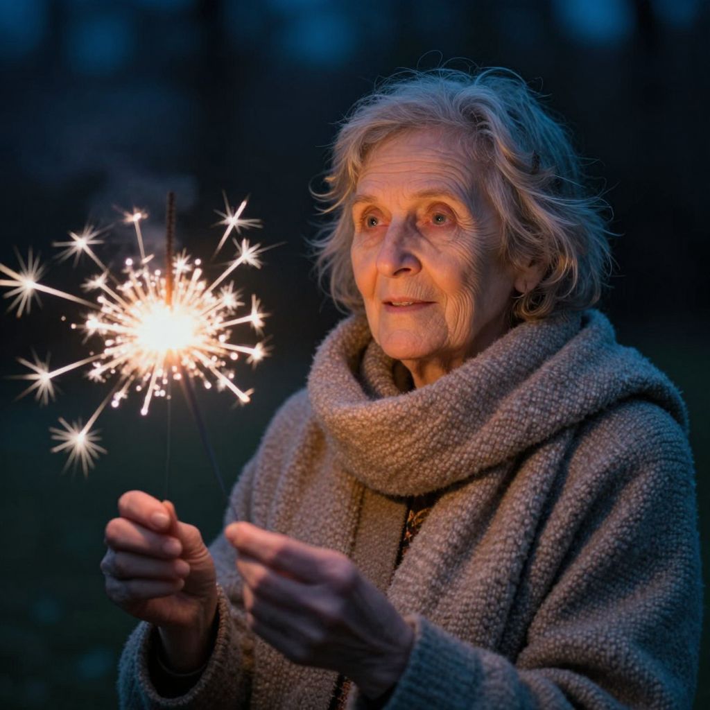 Photograph of an elderly woman with short, gray hair, wearing a thick, beige wool scarf, holding a lit sparkler against a dark, blue