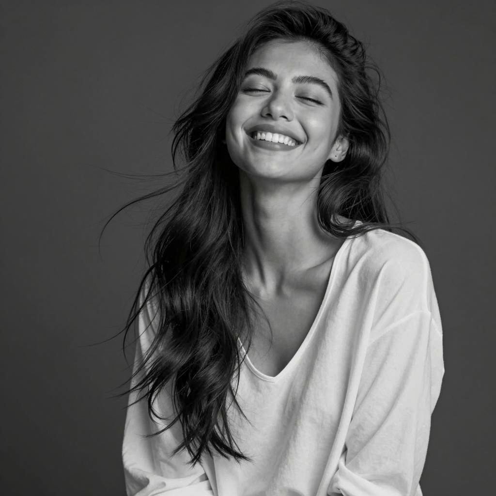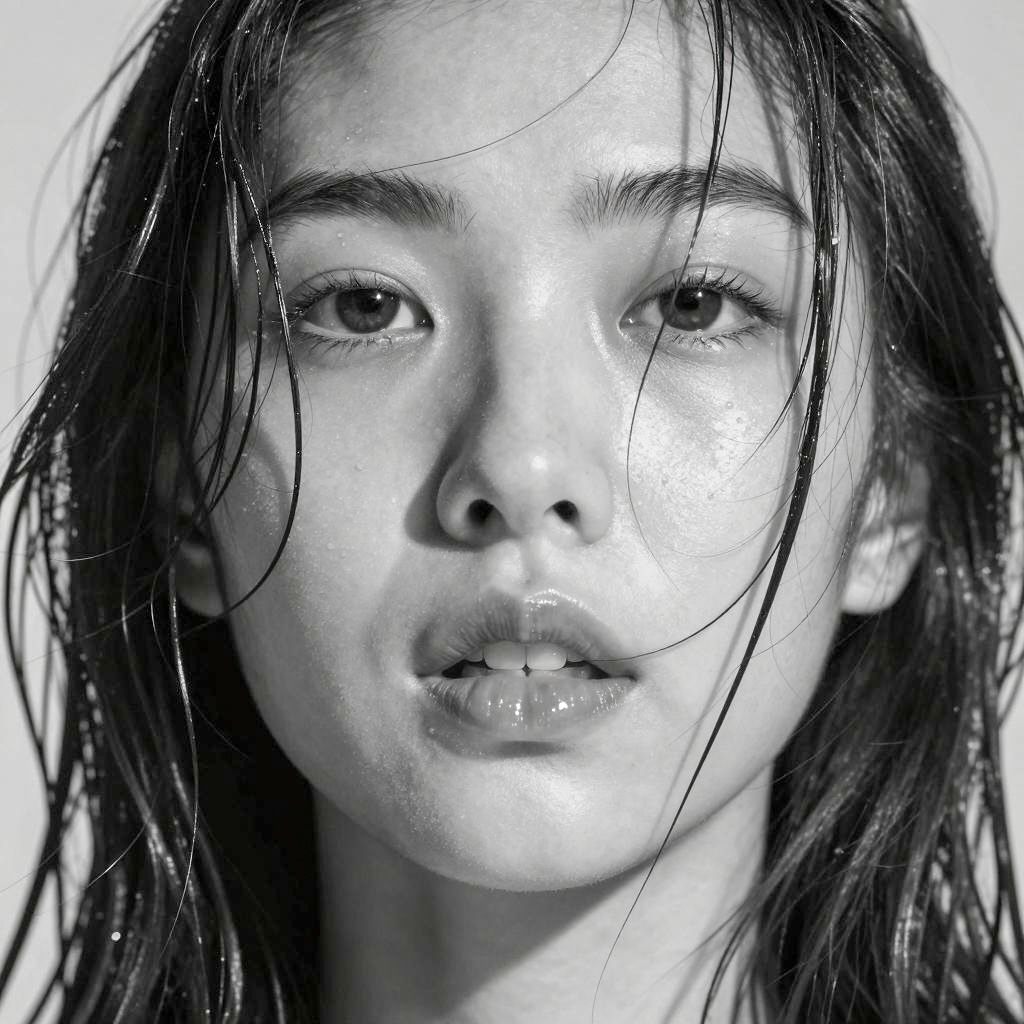 Black and white photograph of a wet, slender woman with long, dark, wet hair, wearing a loose, ured wool coat. She covers her eyes with her right hand, head tilted back, smiling broadly. Her left hand rests near her collarbone. The background is plain white. Her skin is smooth, and her teeth are visible. Water drips from her hair.