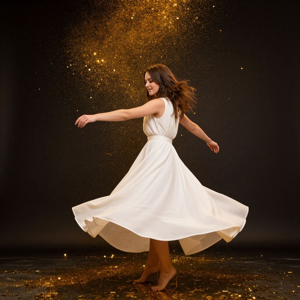 A woman in a flowing white dress twirls gracefully against a dark backdrop, surrounded by a cascade of golden confetti that dances around her in a shimmering display of joy and celebration.