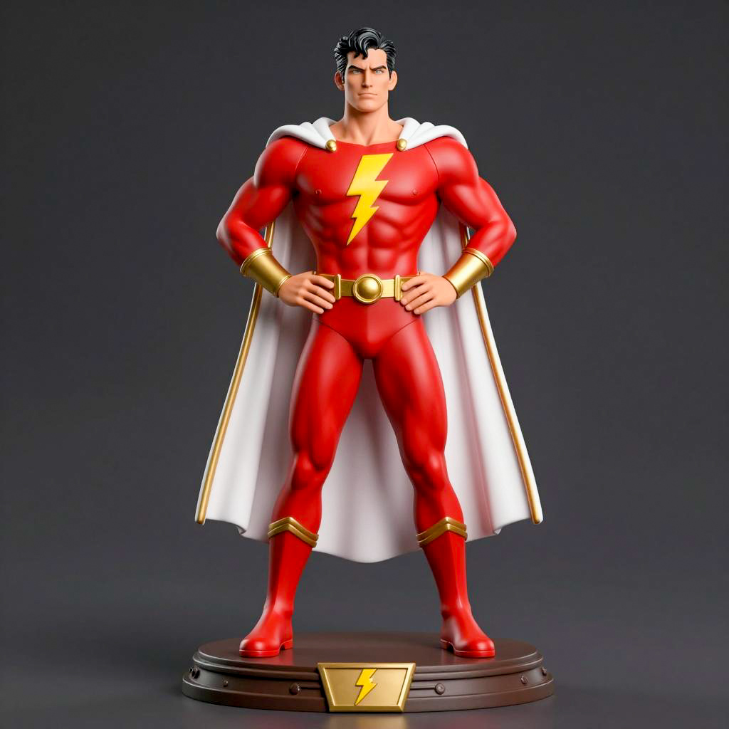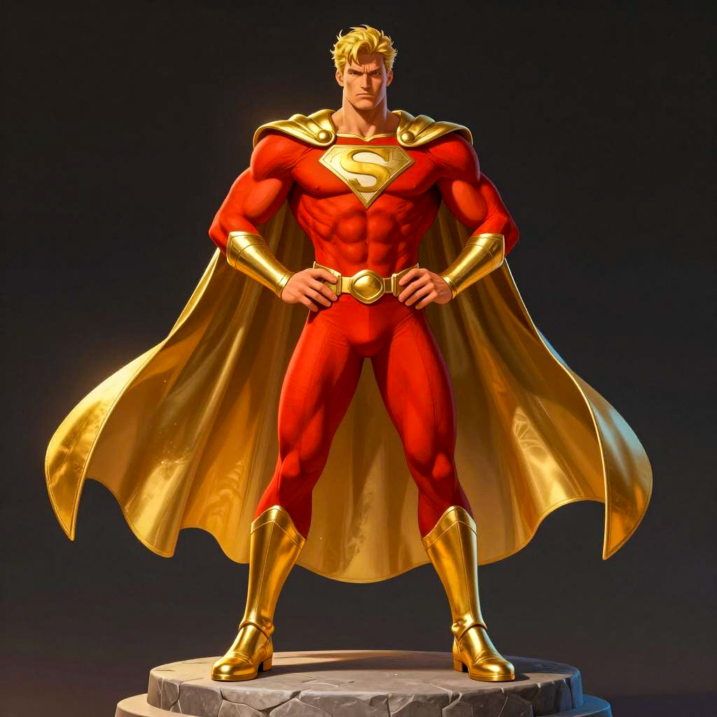 Illustration of a muscular, blonde male superhero with a red costume and gold accents. He stands on a stone pedestal, hands on hips, wearing a flowing gold cape, gold boots, and a golden chest emblem. His expression is determined. The background is dark.