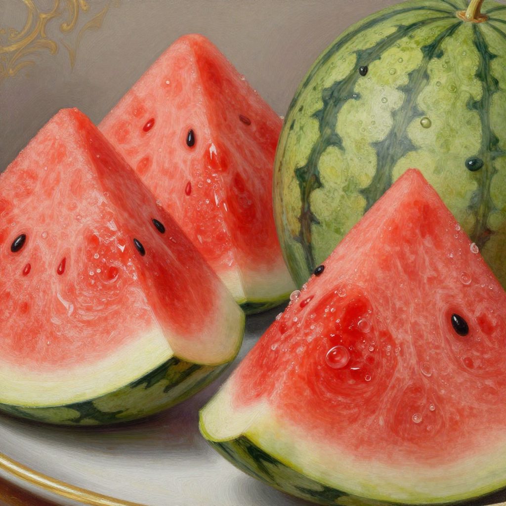 Watermelon painting renaissance style, close-up of ripe watermelon halves with dew, rendered with delicate brushwork and soft shadows, classical composition, baroque elegance, saturated hues