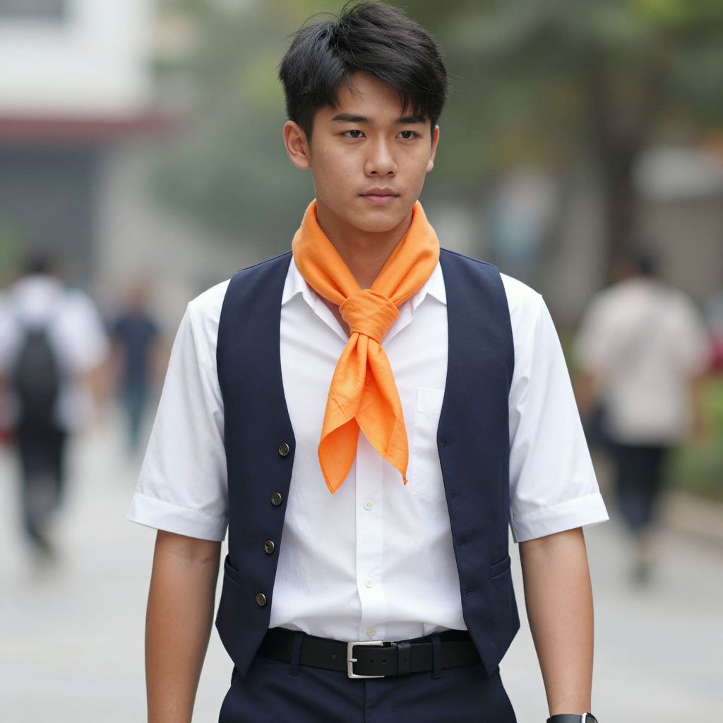 Photograph of an Asian teenage boy with short black hair, wearing a white shirt, black vest, and bright orange necktie, standing outdoors with a