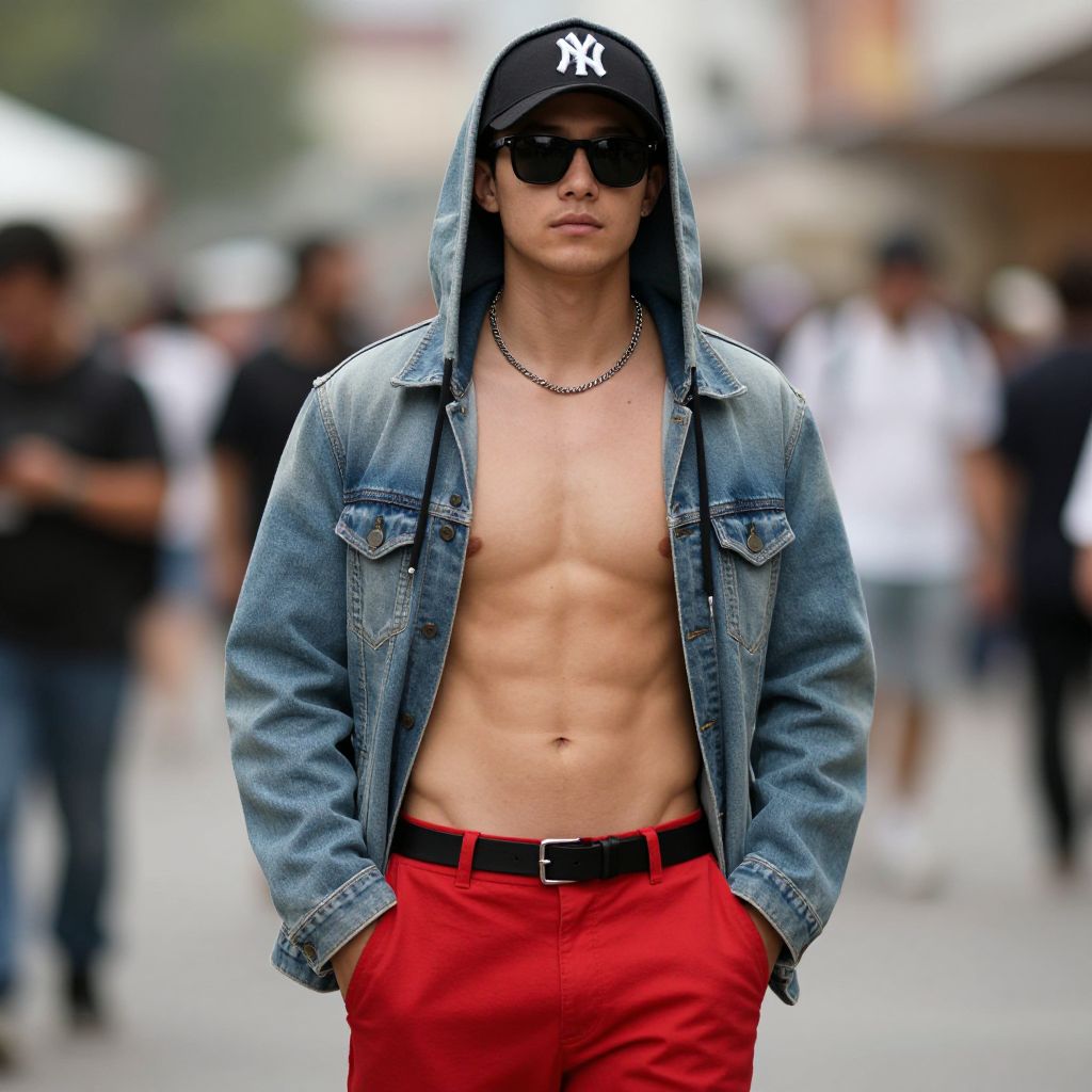 Photograph of a muscular, shirtless young man with fair skin, wearing a black NY hat, sunglasses, denim jacket, and red pants, standing