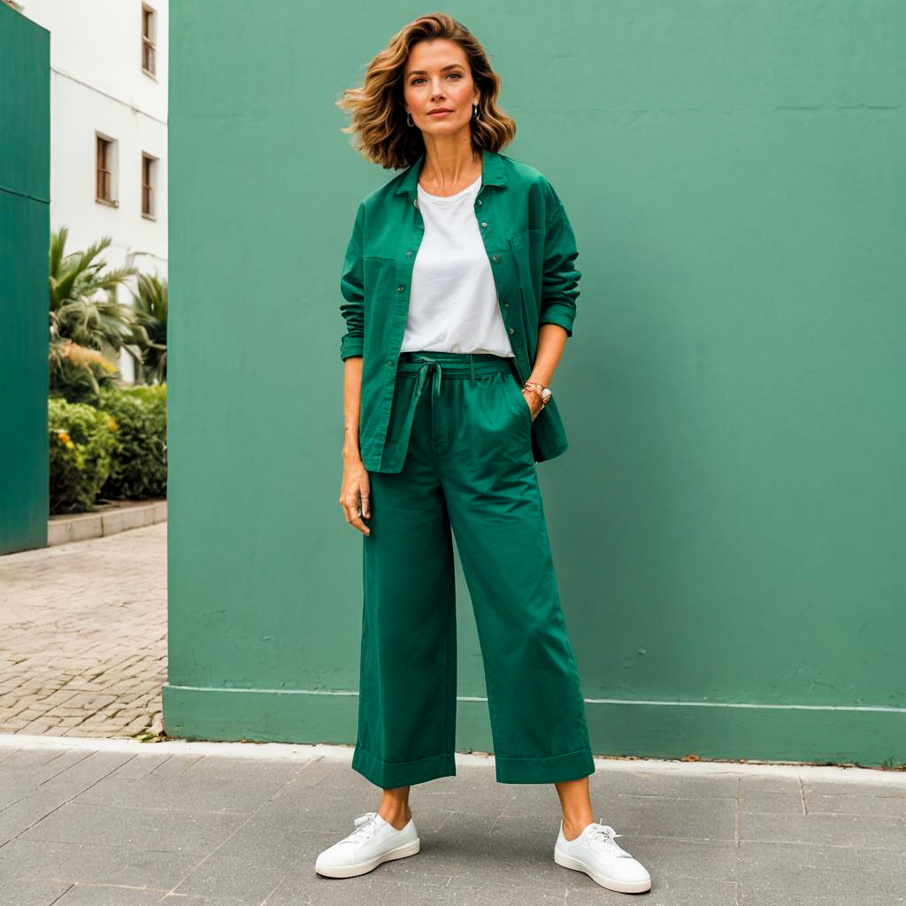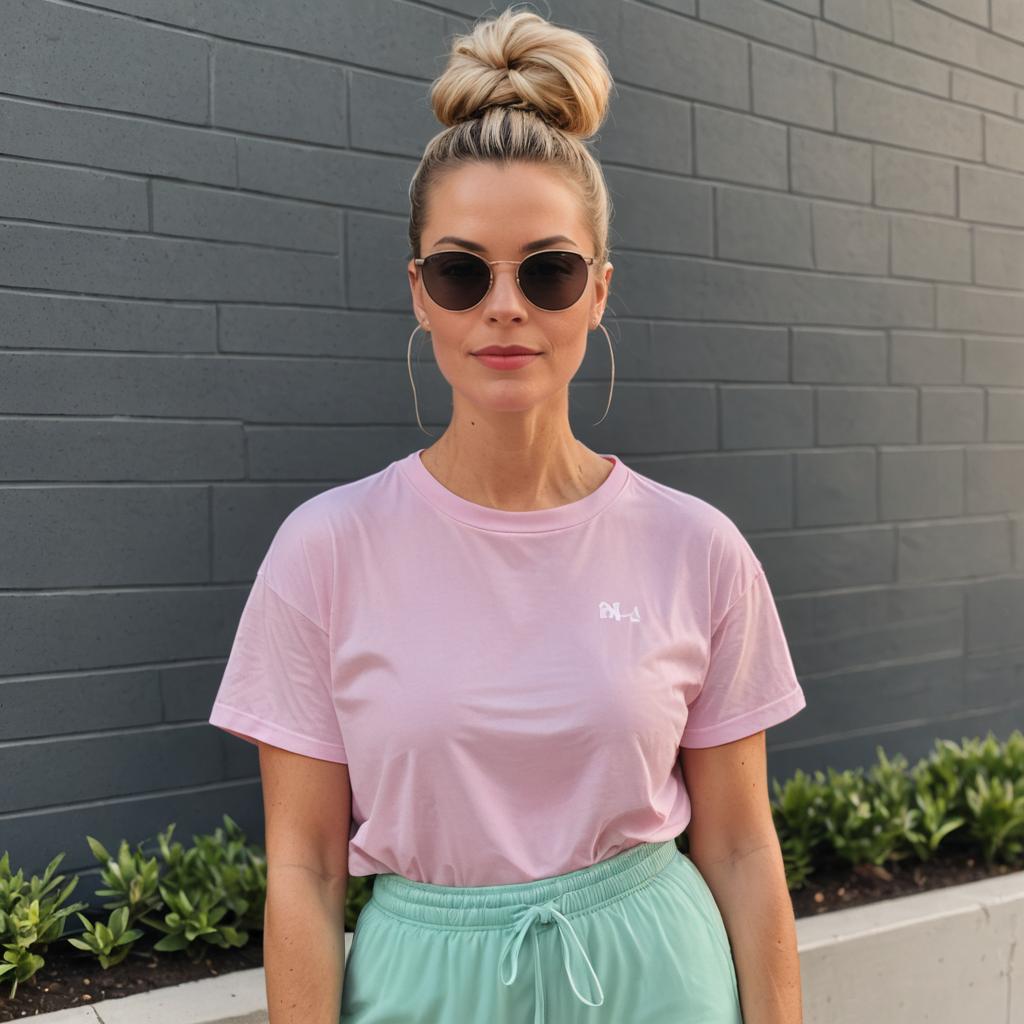 Portrait of a tall woman with shaggy blonde hair wearing a pastel pink polyester t-shirt and light green pastel leggings. She is accessorized with practical round sunglasses and a black wristwatch, standing on a paved area with a scenic mountainous backdrop and pine trees in the distance. The setting appears to be a quiet mountain resort or rural town on a clear, sunny day.