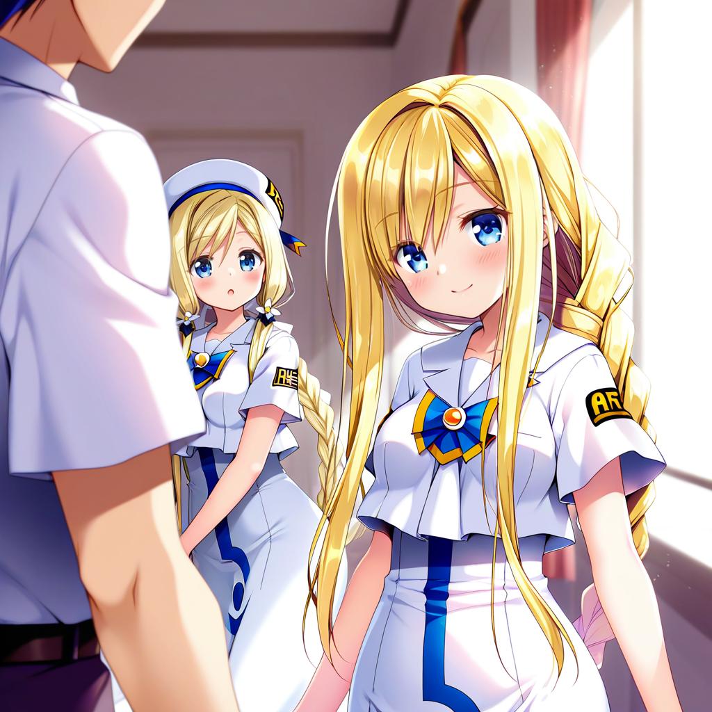 Alicia florence, aria (manga), 1girl, blue eyes, blonde hair, long hair, very long hair, braided ponytail, single braid, aria company uniform, uniform, aria company uniform, uniform, white dress, long dress, white shirt, short sleeves, sailor collar, blouse, by artist sasai saji, illustrious