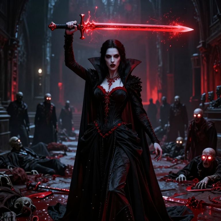 Photograph-like digital illustration of a dark, gothic scene. A pale-skinned woman with long, black hair stands at the center, holding a glowing red sword above her head. She wears a black, Gothic-style dress with a high collar and fur trim, accentuating her figure. The background features a dimly lit, cathedral-like setting with tall, gothic arches. Surrounding her are numerous undead creatures with glowing red eyes, lying on a blood-stained floor. The atmosphere is dark and ominous, with red and black hues dominating the color palette, enhancing the sinister and supernatural mood.