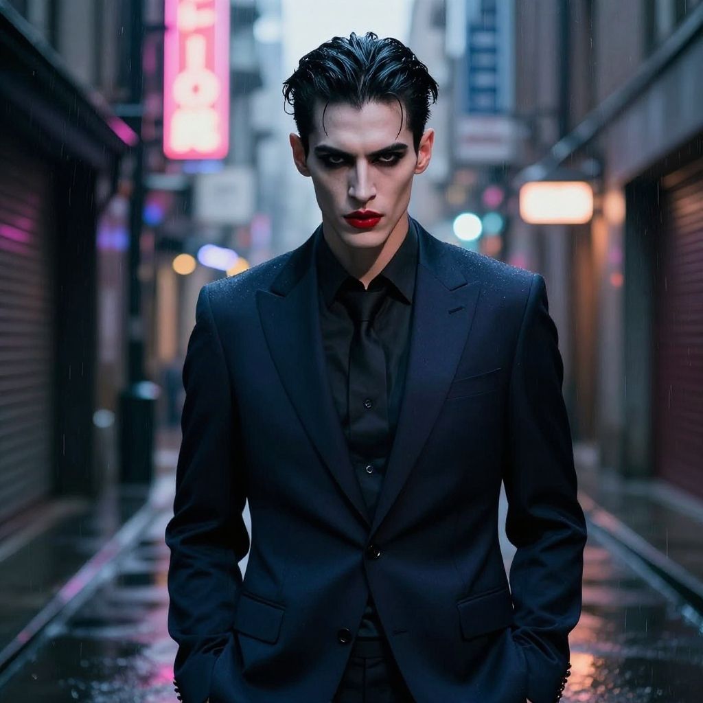 Vampire slicked back hair, striking male with alabaster skin and blood-red lips, wearing a modern tailored suit, neon-lit urban alley with rain reflecting the lights, dramatic and stylish composition
