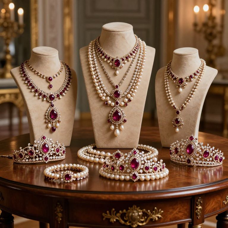 A collection of regal jewelry displayed on a dark wooden table, featuring elaborate necklaces, tiaras and bracelets with pearls, rubies, and diamonds, soft ambient light highlighting the intricate craftsmanship, royal palace background softly blurred