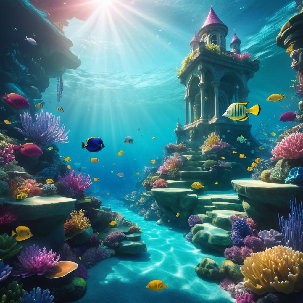 A fantastical underwater scene featuring a majestic castle surrounded by vibrant coral reefs and colorful tropical fish. Sunlight filters through the water, illuminating the diverse marine life and rocky formations supporting the structure. The image depicts a magical underwater kingdom with detailed aquatic vegetation and a variety of fish species.
