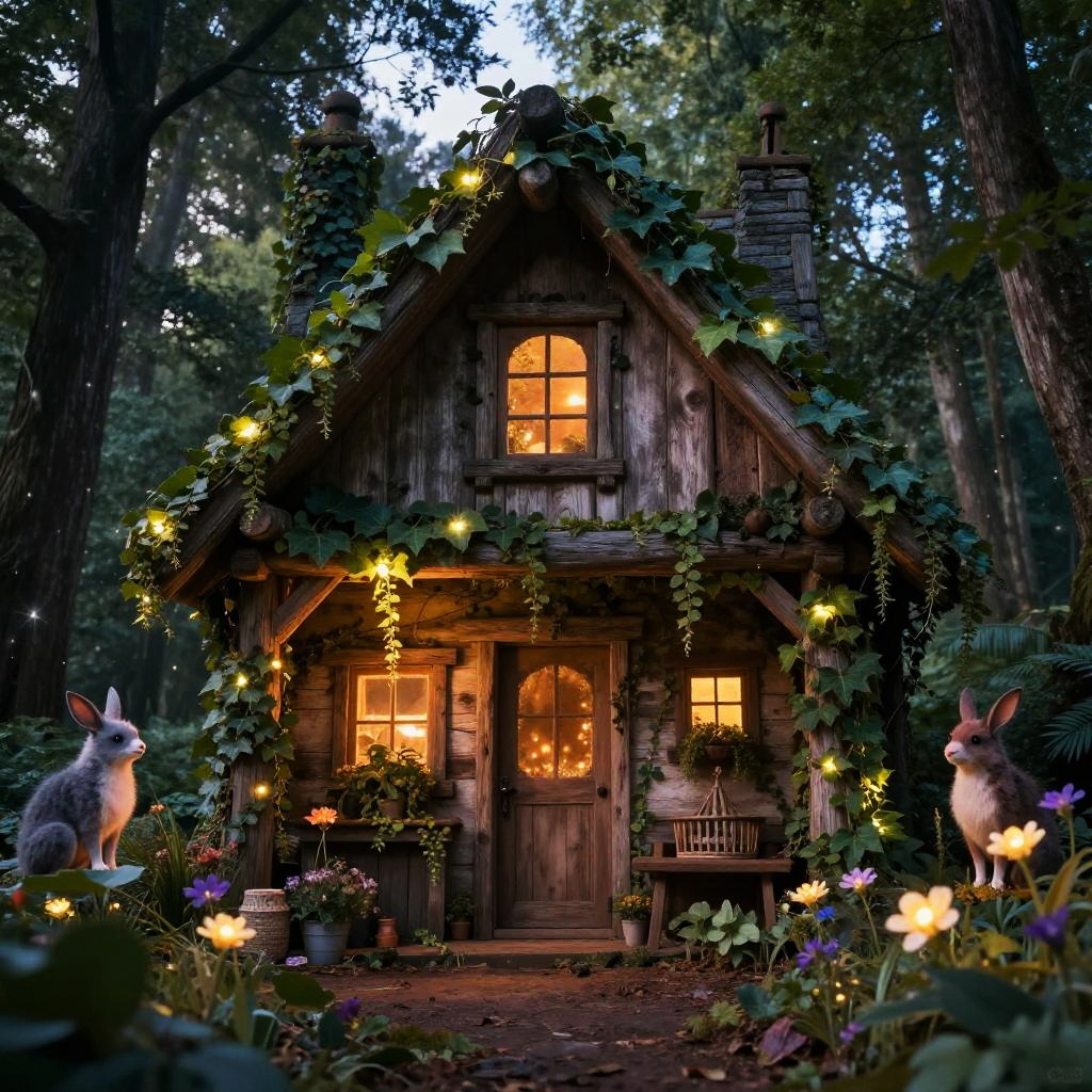 Fantasy forest cabin with rustic wooden walls covered in glowing ivy, surrounded by luminous flowers and sparkling fairy dust, twilight scene with mystical creatures peeking nearby