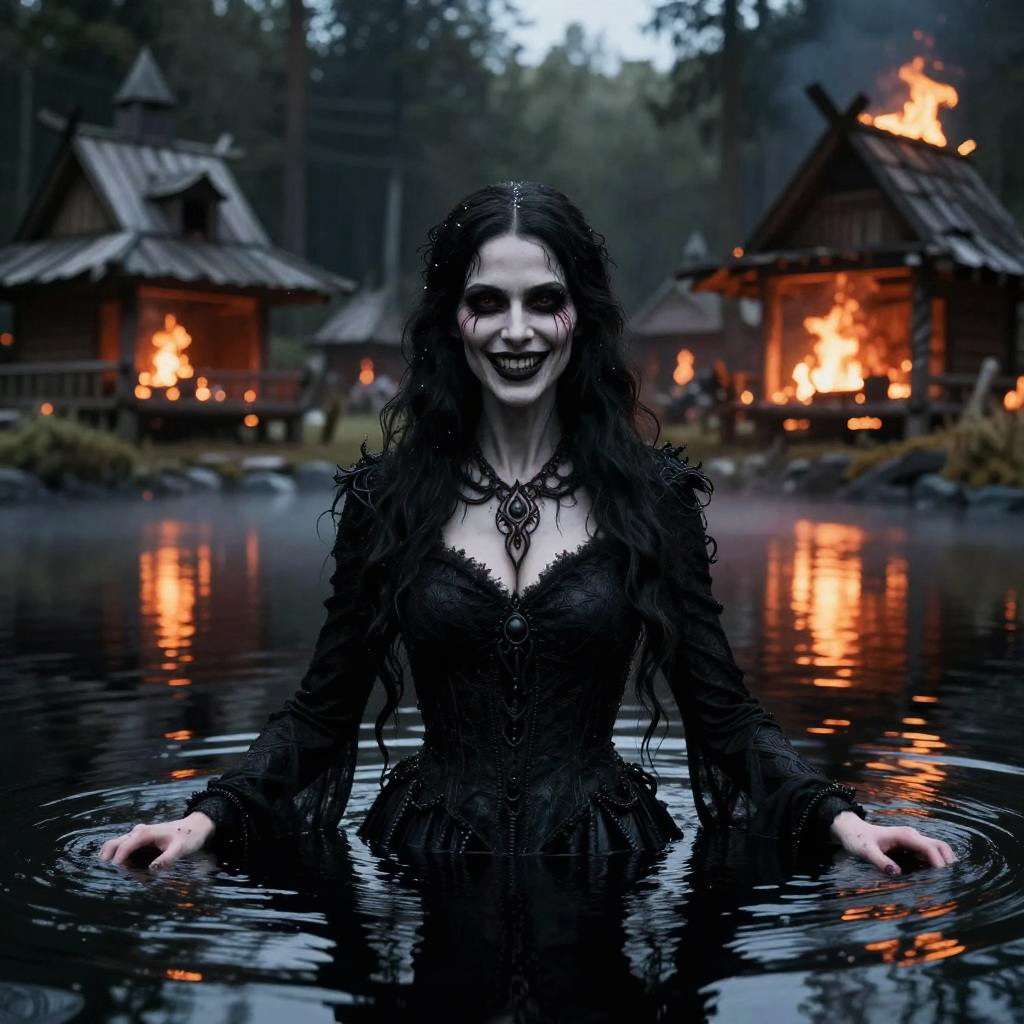 Realistic, a photo of a gothic horror woman in a black lake, beautiful woman, unsettling horror, professional, (Extremely Detailed:1.2), glow effects, godrays, intricate details, sharp focus, dramatic, photorealistic, tribal village, wooden village, burning forest background, sharp contrast, many colours, serious face, smirking