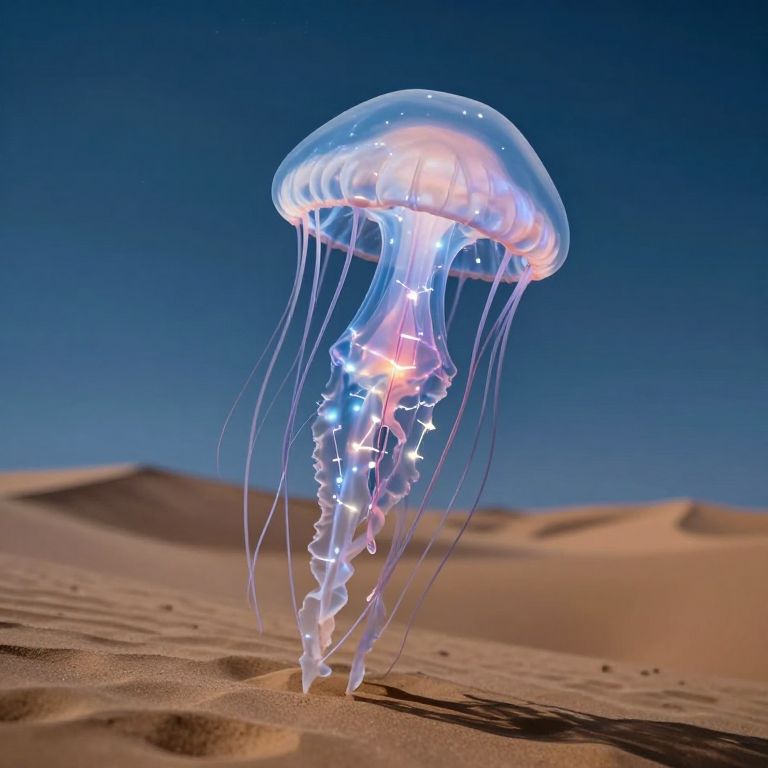A colossal jellyfish made of stardust hovers silently above a desert dune, its pulsing tendrils casting constellations onto the sand below.