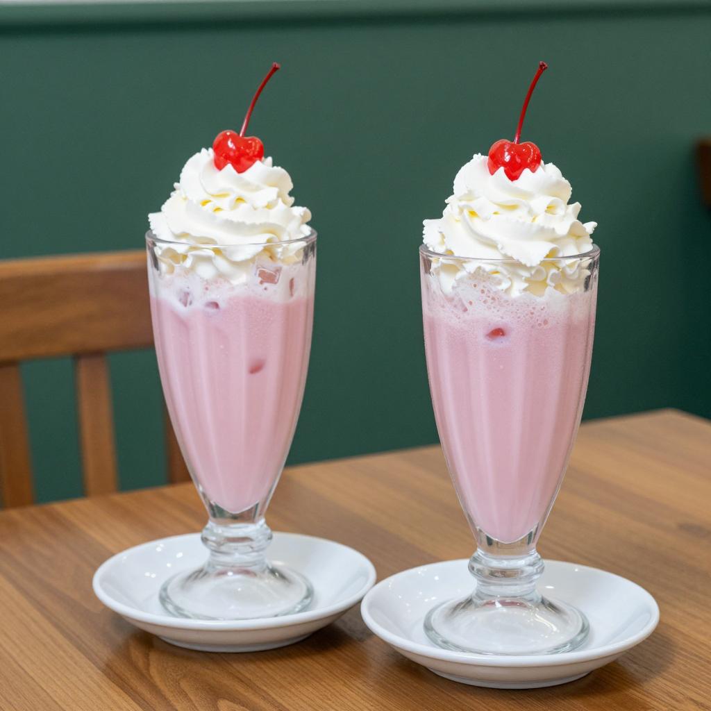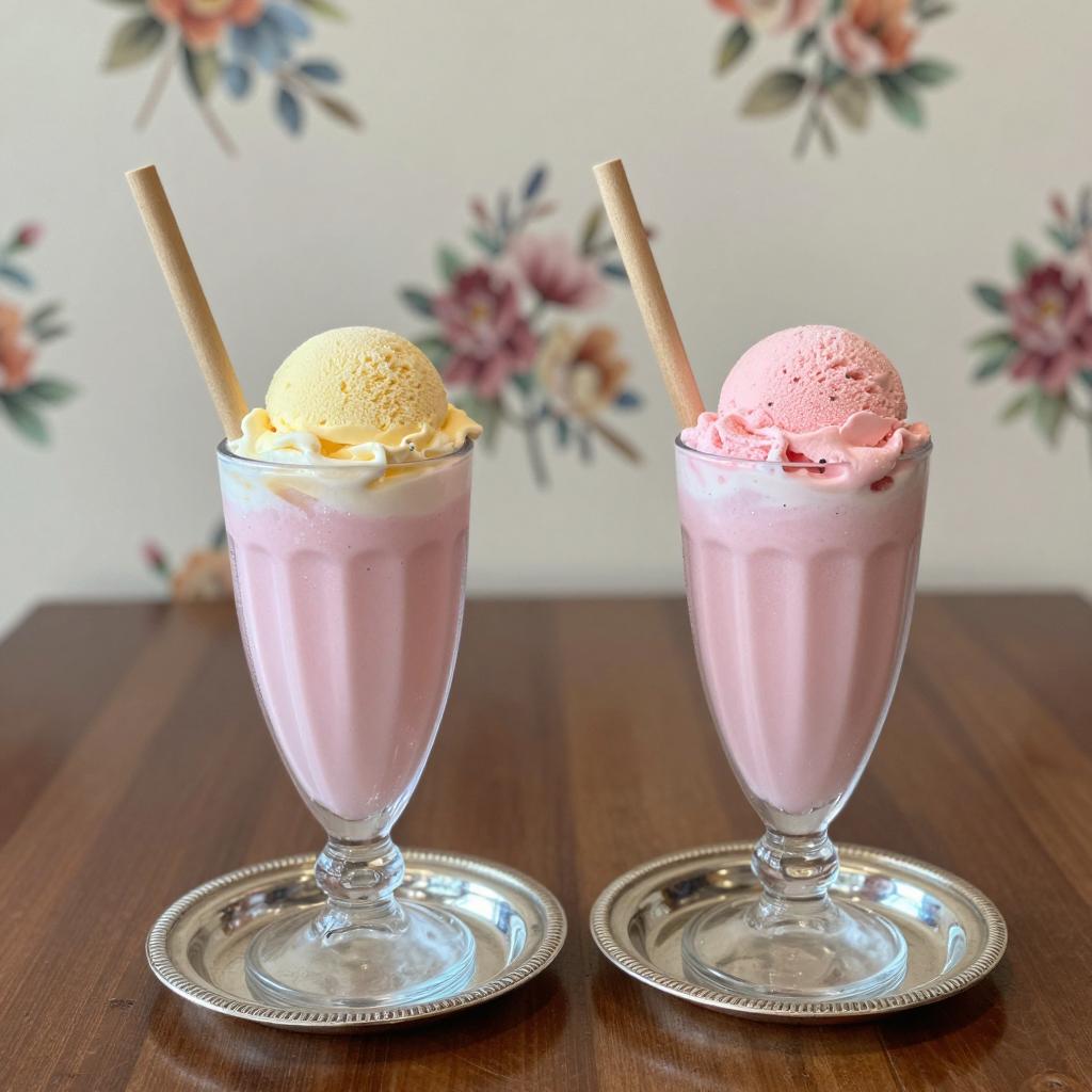 Two tall, glass milkshakes on a wooden table. The left milkshake is clear with a red straw, the right is blue with ice cubes and a blue straw. Both have scoops of vanilla ice cream on top. Background: indoor shopping mall with visible storefronts and people.