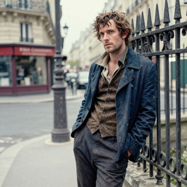 Eponine leaning on a wrought iron fence near a vintage Parisian street corner, distressed fabric textures, melancholic gaze into distance, subtle watercolor palette with muted blues and browns, nostalgic and evocative urban scene from Les Misérables era.