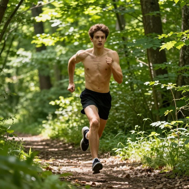 Spry young athlete sprinting across a sunlit forest trail, vibrant green foliage surrounding, dynamic motion captured in mid-stride, detailed muscles and focused expression, morning light filtering through leaves, high energy and agility conveyed vividly.