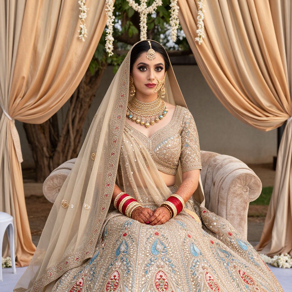 Photograph of an Indian bride in a gold and beige embroidered lehenga, red bangles, and jewelry, seated on an ornate chair, with
