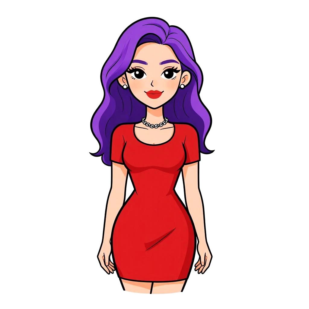 Woman with pretty face and pretty hair. smiling Woman, chic, red mini dress, fitted silhouette, short sleeves, round neckline, chain necklace accessory. --sref 1467