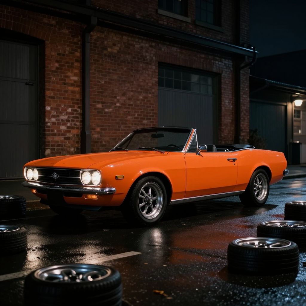 Classic burnt orange convertible car parked on a wet street at night, surrounded by scattered classic wheels, set against an industrial brick building background. Dramatic lighting creates a cinematic action movie atmosphere.