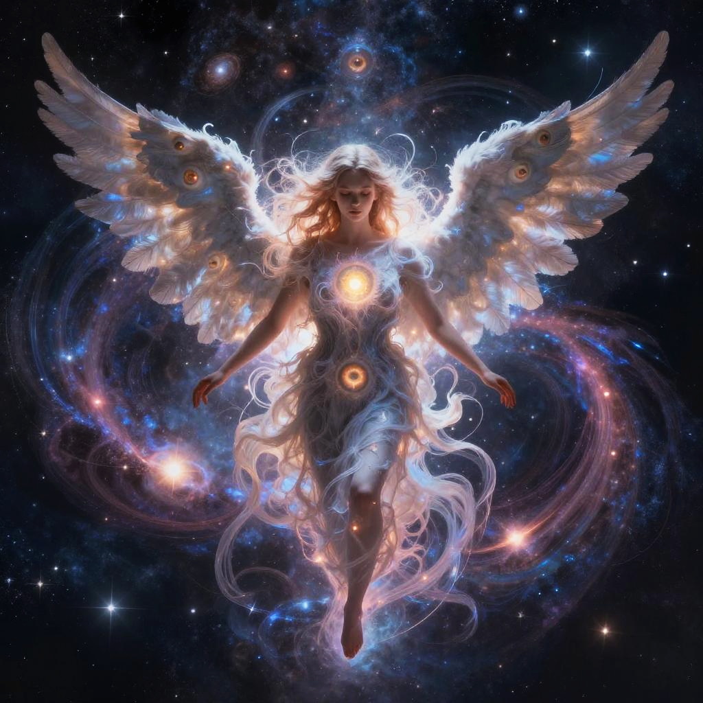 Multiple eyed angel surrounded by swirling cosmic energy, vast star-filled galaxy background, eyes emitting pulsating light, surreal and majestic, ultra-detailed fantasy illustration