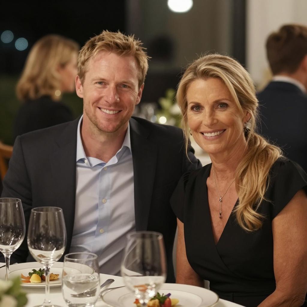 Photograph of three people smiling closely together. The man in the middle has short brown hair, wearing a green jacket with a red emblem, leaning slightly forward. The woman on the right has short blonde hair, wearing a white jacket, with her arm around the man. The person on the left has dark brown hair, wearing a brown jacket over a pink shirt. Background includes a camera and technical equipment. The man on the left has his arm around the woman on the right. All three have intense, happy expressions.